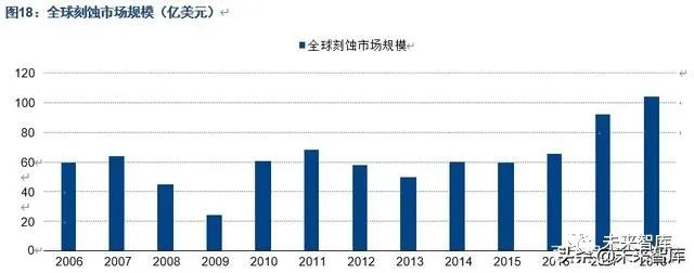 2017 年,刻蚀设备在产线中的价值占比达到 24%左右,取代光刻机成为晶圆加工厂投资额最高的设备,2018年刻蚀机销售额超过 100 亿美元。自 2012 年以来,刻蚀机在晶圆厂设备中的价值占比逐步提升,与之对应的是光刻机的价值占比下滑,这其中的主要原因来自于光刻机技术瓶颈和芯片结构变化带来的晶圆加工工序的调整。