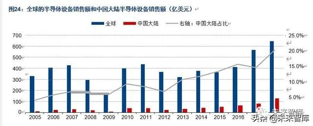 海外龙头企业的快速成长期伴随着全球半导体市场的高速增长。2000 年以后,全球设备市场增速有所放缓,但中国大陆半导体产业刚刚起步。2005 年中国大陆半导体设备销售额约 13 亿美元,2018 年上升至 131 亿美元,全球占比从 4%增长至 20%,尤以 2016 年以后投资增加明显。国际半导体产业协会(SEMI)估计, 2020 年中国半导体设备的投资额可能达到 200 亿美元,是全球投资最高的国家。