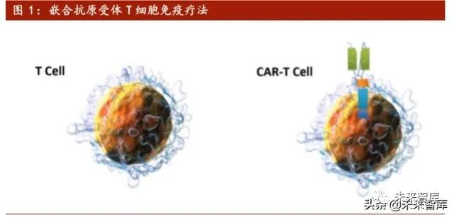 Car-T(Chimeric antigen receptor T cell,嵌合抗原受体 T 细胞)疗法,是指通过基因克隆技术对具有免疫球蛋白(Ig)的抗原结合区的 T 细胞受体的进行基因改造,将带有特异性抗原识别结构域及 T 细胞激活信号的遗传物质转入T 细胞,使 T 细胞直接与肿瘤细胞表面的特异性抗原相结合而被激活。