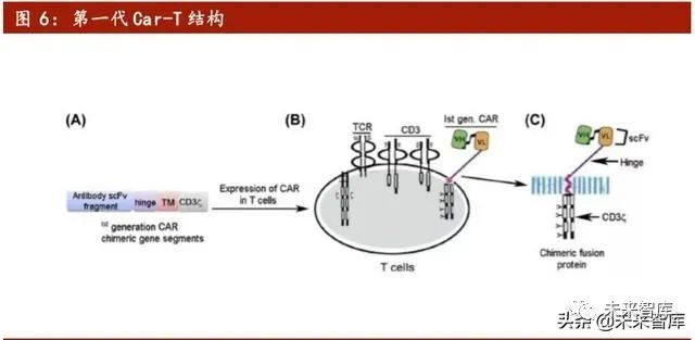 第一代 CAR 的组织结构:(A)编码 ScFv 片段的第一代 CAR 的嵌合基因序列、可识别肿瘤相关抗原的抗原结合区、铰链、跨膜结构域(TM)和信号域,例如 CD3ζ。第一代 CARs 没有共刺激分子,但包含细胞内信号域。(B)第一代嵌合 CAR在 T 细胞中的表达。使用各种基因转染方法在 T 细胞中表达嵌合基因序列。T 细胞中的嵌合基因序列通过蛋白质翻译后表达不干扰内源性 T 细胞受体的功能齐全的 CAR。( C)在 T 细胞中表达时,第一代 CAR 可变区的放大视图。