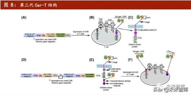 第一代 CARs 不包含共刺激分子。包括第一代、第二代和第三代 CARs 在内的所有CARs 都装有将 scFv 与细胞内信号结构域连接的铰链。铰链通常来自 CD8α糖蛋白或 IgG 恒定域。CD8α铰链可以通过其疏水性跨膜结构域透过细胞膜。跨膜结构域的一部分可能包含共刺激分子的序列。最后,跨膜结构域与融合内分裂素融合蛋白进行融合。融合内分裂素融合蛋白是由共刺激分子组成并融合 FcεRIγ链或 CD3ε或 CD3ζ信号域。共刺激分子通常包含融合有源自 CD3ε序列胞内信号传导域的 CD28 或 4-IBB 或 OX-40。除 scFv 之外,第三代 CAR 还包含融合有单链单载体上(例如逆转录病毒载体)或双链单载体上(例如逆转录病毒、慢病毒载体)CD3ζ内结构域的两个共刺激分子。裂解后的双链单载体表达两条链,其中一条链含有融合有共刺激分子和 CD3ζ内域的 scFv,而另一条链可能会产生融合有共刺激分子,但没有 CD3ζ内域的 scFv。