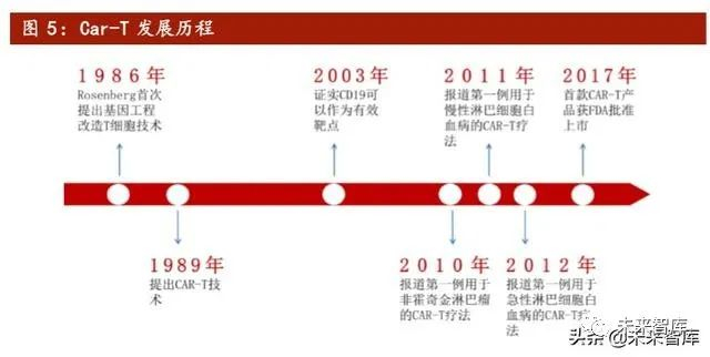 Car-T疗法最早由Gross等于上世纪80年末提出,至今已有30余年的发展历程, 是目前过继性 T 细胞治疗中发展最为成熟的技术之一,FDA 在 2017 年批准了首 个 CAR-T 细胞治疗产品,更是正式宣告了 Car-T 技术的产业化成熟。
