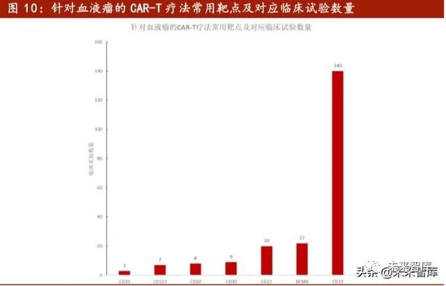 目前,Car-T 在血液瘤的研究相对更为成熟,全球开展了大量临床试验探索 CD19外的新靶点。目前有应用价值的针对恶性 B 细胞肿瘤的临床前和临床靶标还包括CD22、CD20,ROR1,CD37 和 kappa 轻链,CD138、BCMA,SLAMF7,CD38、整合素β7。