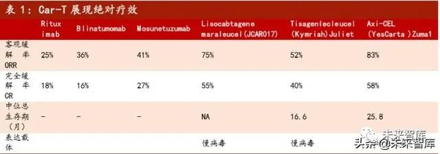 2017 年 10 月 18 日,Kite Pharma 的 CAR-T 产品 YesCarta(axicabtagene ciloleucel,KTE-C19)经美国 FDA 批准上市,用于治疗成人复发或难治性大 B细胞淋巴瘤。YesCarta 是全球第二款获批上市的 CAR-T 产品,同时也是第一个用于治疗非霍奇金淋巴瘤的 CAR-T 产品。