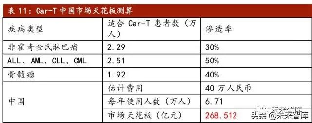 我国 2018 年新增癌症人数为 380 万人(血液瘤约占 9.9%),我们假定血液流中 T细胞异常增值引起约占 30%。其中急性淋巴细胞白血病中适合二线以下疗法的患者约 20%,折算不适合 Car-T 治疗及生产损耗后的预估治疗渗透率 30%;骨髓瘤目前还无法治愈,常用的来那度胺等药物只能延长患者的无进展生存期(PFS),国外临床试验显示CAR-T疗法对骨髓瘤疗效显著,假定适合Car-T患者约占30%,渗透率为 50%;非霍奇金淋巴瘤的一线用药是利妥昔单抗+化疗,疗效较好,出现复发或转移的比例在 40%左右,并预估 CAR-T 治疗渗透率为 40%。