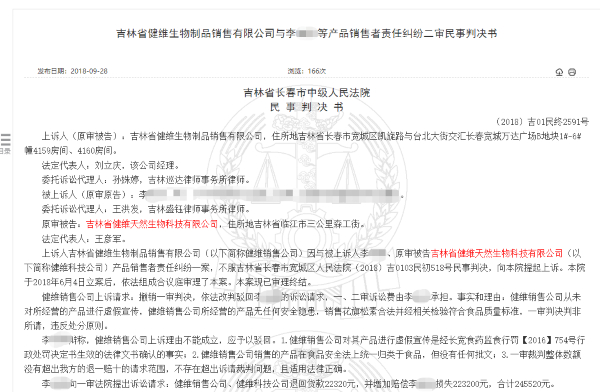 中国裁判文书网于2018年9月28日发布的一则民事判决书显示,消费者李某于2017年10月27日在被告健维销售公司购买由健维生物公司生产的价值22320元“花旗松素”六盒,发现被骗后,向吉林省长春市中级人民法院提起上诉。法院最终判决吉林省健维生物制品销售有限公司返还李某购货款22320元,并向李某支付货款22320元三倍的赔偿款66960元,合计89280元;健维生物公司对上述款项承担共同给付义务。