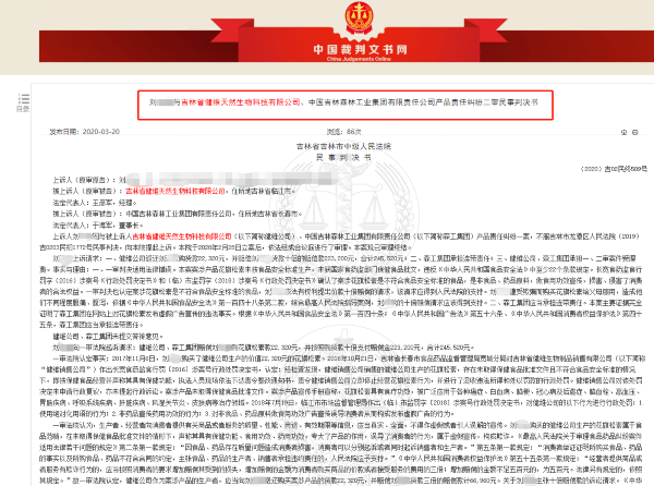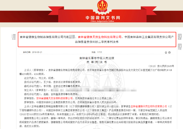 中国裁判文书网2018年9月21日发布的一则民事判决书显示,消费者赵某于2017年8月25日在健维销售公司购买由健维生物公司生产的价值22320元“花旗松素”六盒,发现被骗后,向吉林省长春市中级人民法院提起上诉,法院最终判决吉林省健维生物制品销售有限公司返还赵某购货款22320元,并向赵某支付货款22320元三倍的赔偿款66960元,合计89280元;健维生物公司对上述款项承担共同给付义务。