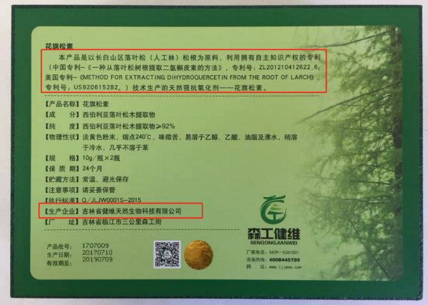 据“森工健维官方”微信公众号2019年11月7日发布的“森工健维官方公众号正式上线啦”一文介绍,“吉林健维公司是吉林森工集团2012年斥巨资、按照国家GMP和美国USP双重标准创建的现代化植物提取生产企业。隶属于大型上市国企—中国吉林森工集团,是中国专业从事花旗松素、阿拉伯半乳聚糖研发、生产、销售和服务于一体的现代高科技企业。每年拥有20000立方米人工落叶松松根原材料,可提供年产15吨花旗松素原材料供应,是世界知名的花旗松素生产基地。”