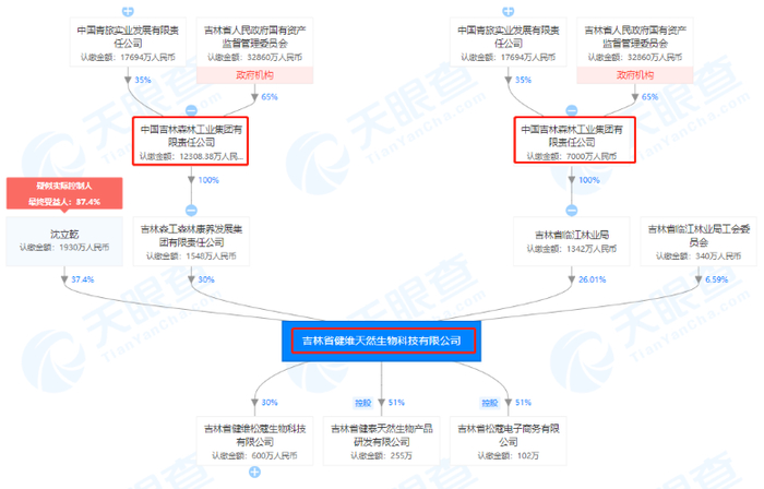 值得注意的是,天眼查显示,健维生物公司为中国吉林森林工业集团有限责任公司(以下简称“吉林森工集团”)旗下控股公司:吉林森工集团通过旗下全资子公司吉林森工康养集团、吉林省临江林业局分别持有吉林健维生物公司30%股份及26.01%股份,合计持有该公司56.01%的股份。
