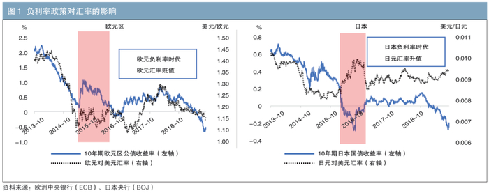支持负利率政策的人认为,在汇率层面,负利率将加大本币与外币的利率逆差,导致本币贬值,从而改善出口,对经济产生提振作用。然而从现实来看,汇率的变化并非受单一变量的影响,还受到外债、资本流动等多方面因素的冲击;究竟是汇率贬值更有利于本国经济还是汇率升值更有利于本国经济,还难以确定,因为汇率对经济的影响还受到更多变量的约束。以欧元区和日本为例,这两大经济体在实施负利率政策的过程中,欧元和日元汇率呈现截然不同的变化。其中,日元汇率一度升值,欧元汇率则表现出微弱的贬值趋势(见图1)。
