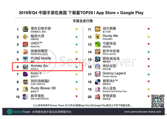在游戏领域,“流量+”的实践已经获得成功,赤子城科技打造出了Archery Go、Beetles.io等一系列爆款游戏产品。其中,休闲射箭游戏Archery Go在Sensor Tower发布的2019年Q4中国手游在美国下载量TOP20中排名第六,紧随PUBG Mobile之后。