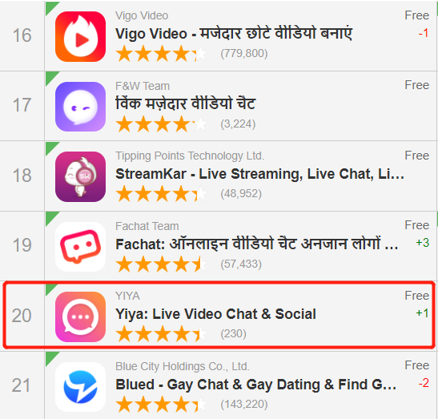 Yiya推出后获得了良好的市场反响,上线不到一个月,就进入印度Google Play社交应用下载榜TOP 20,势头强劲。