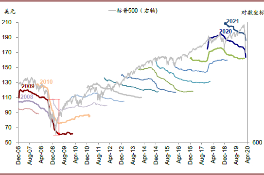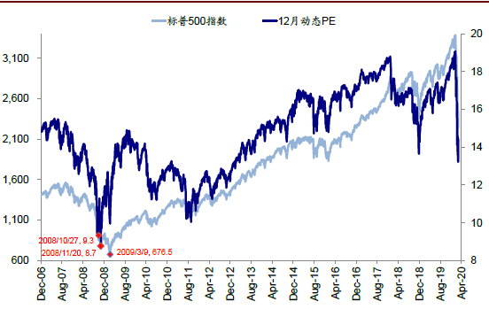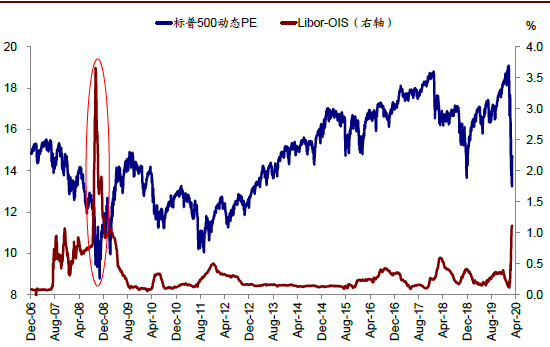 ► 估值先于市场见底,底部基本对应流动性冲击高峰。从2008年的经验来看,虽然后续还会出现波折,但整体上PE(2008年10月)先于市场见底(2009年3月),当然这也与作为分母EPS持续下调有关。粗略看,2008年标普500指数PE底部大体出现在10月附近,基本对应流动性冲击的高峰,也即Libor-OIS利差的最高点。随后虽然还会出现波折,但基本没有再出现非常大幅的收缩。