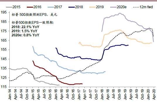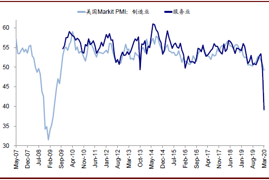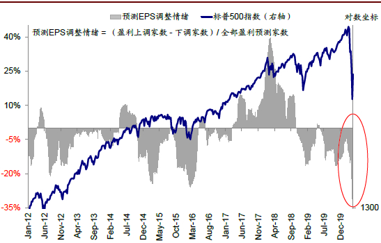 2) 基本面下行压力逐渐开始显现,近期市场盈利预期下调逐渐加速。因为疫情和“抗疫”导致的经济停摆对于基本面和企业盈利的影响将逐渐开始显现。3月美国PMI已经开始明显趋弱,特别是受疫情影响较大的服务业。同时,企业盈利的市场一致预期也在快速下调。