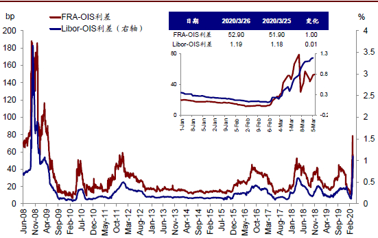 图表: FRA-OIS近期有所回落,但Libor-OIS继续抬升
