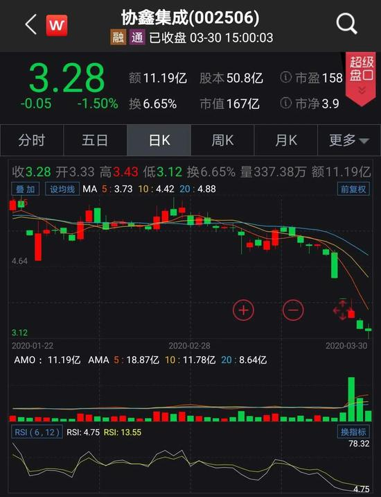 3月24日,在连续多日阴跌之后,协鑫集成突然无量跌停,当日股价报收4.4元/股。