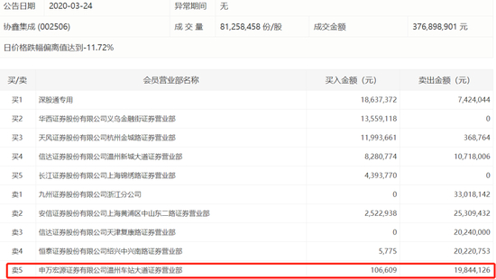 值得注意的是,在协鑫集成股价大跌的过程中,申万宏源证券有限公司温州车站大道证券营业部屡屡出现在龙虎榜卖方前五。多位市场人士告诉中国证券报记者,该席位是著名的江浙游资席位。