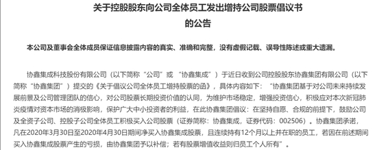 协鑫集团承诺,凡在2020年3月30日至2020年4月30日期间净买入协鑫集成股票,且连续持有12个月以上并在职的员工,若因在前述期间买入协鑫集成股票产生的亏损,由协鑫集团予以补偿;若有股票增值收益则归员工个人所有。