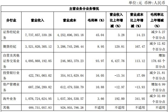 报告期内,中国银河证券经纪营业收入人民币77.38亿元,同比增加3.28%,毛利率45.04%,比上年减少5.27个百分点;期货经纪业务营业收入人民币35.22亿元,同比增加129.81%,毛利率8.95%,比上年减少12.82个百分点;自营及其他证券交易业务营业收入人民币40.96亿元,同比增加6427.76%,毛利率93.97%,比上年增加178.65个百分点;投资银行业务营业收入人民币4.23亿元,同比减少13.34%,毛利率16.05%,比上年减少21.81个百分点;资产管理业务营业收入人民币6.87亿元,同比减少12.97%,毛利率10.88%,比上年增加0.99个百分点;海外业务营业收入人民币10.77亿元,同比增加192.00%,毛利率3.66%,比上年减少32.69个百分点。