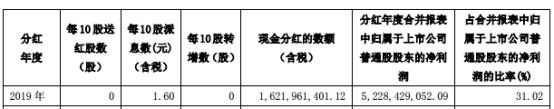 中国银河2019年度利润分配预案为:公司拟派发现金股利为人民币16.22亿元(含税),以2019年末总股本101.37亿股计算,每10股派发现金股利人民币1.60元(含税),占2019年度合并报表中归属于上市公司普通股股东的净利润的比率为31.02%;若公司于股权登记日因配售、回购等原因,使得公司股本总数发生变化,每股派发现金股利的金额将在人民币16.22亿元(含税)的总金额内作相应的调整。