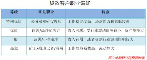 虽然在宣传材料里不会提及,职业确实是银行授信考虑的重要因素。下图展现了金融机构对于不同贷款客户的职业偏好: