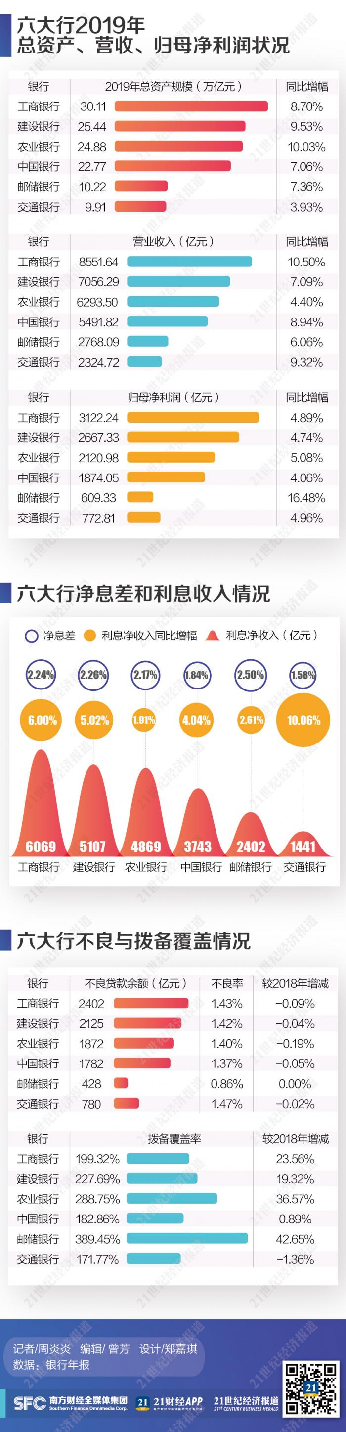 截至3月30日,工、农、中、建、交、邮储六大国有银行纷纷公开了自己的2019年度成绩单。21世纪经济报道从资产规模、营收、净利润、不良率、拨备覆盖率、净息差、信用卡业务方面进行了比较。