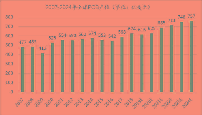 根据Prismark统计,2018年全球PCB产业总产值达623.96亿美元,同比增长6.0%。2019年受贸易摩擦等因素影响,Prismark预测全球PCB行业产值约为613.4亿美元,同比小幅下滑1.7%。未来五年全球PCB市场将保持温和增长,物联网、汽车电子、工业4.0、云端服务器、存储设备等将成为驱动PCB需求增长的新方向。