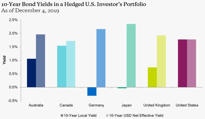 许多投资者希望通过增加国际债券来分散投资组合的利率风险,但他们不愿在汇率上押注。为了减轻这种风险,他们通过外汇远期和交叉货币基础互换进行对冲。假设每个国家的信用都是相等的,这些货币对冲的外国债券的收益与投资者的国内债券大致相同。这是因为对冲的收益为正,高于债券的负收益。从理论上讲,进行了汇率对冲的美国投资者,他们投资德国国债或日本国债的收益率应该与投资美国国债的收益率差不多。
