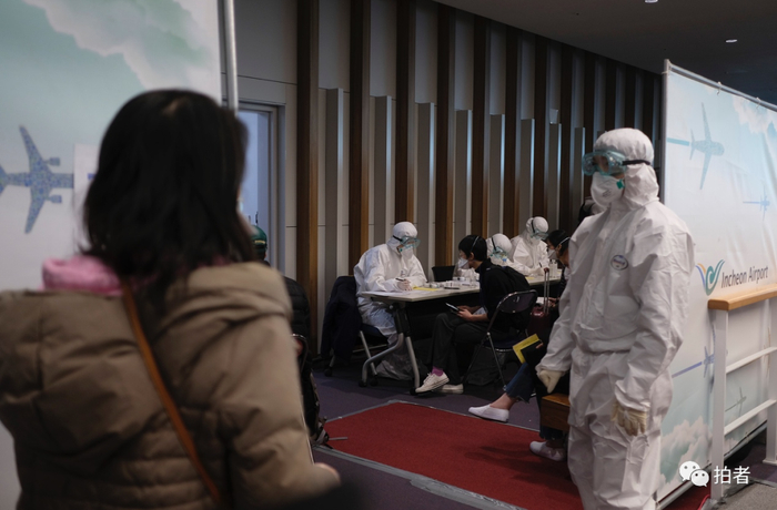 ▲当地时间3月23日,韩国首尔仁川国际机场,检查点“全副武装”的医生。
