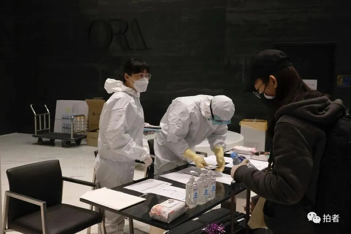 ▲当地时间3月24日凌晨,ORA酒店大堂,身着防护服的工作人员为隔离人员分配房间。