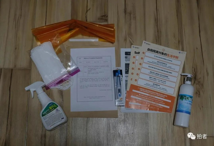 ▲当地时间3月27日,首尔江北区工作人员给我快递来了一瓶洗手液、一包普通口罩、消毒喷雾、橙色医疗垃圾专用垃圾袋以及一支快速测温计。此外,包裹里还有一个写有我的姓名、住址及详细隔离日期的文件,文件上还说,如果不严格履行隔离义务,我将会面临最高300万韩元的罚款。