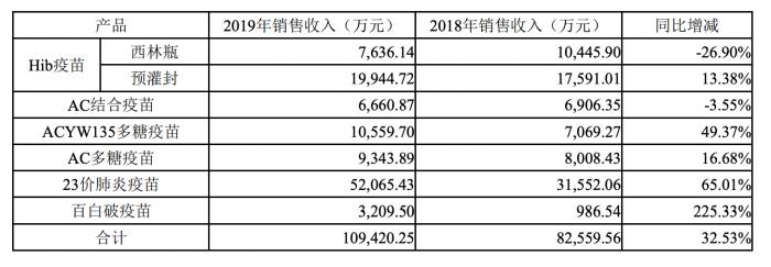 2019年,沃森生物营业收入11.21亿元,净利润1.41亿元。 2019年自主疫苗产品销售收入较2018年同比增长32.53%。各产品销售情况如下:
