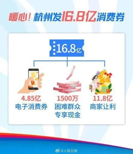 3月27日起,杭州将陆续向全体在杭人员(包括域外来杭人员)发放消费券。本轮消费券政府发放额度为5亿元,其中1500万元用于困难群众的消费补助,剩余4.85亿元用于电子消费券发放,消费券活动周期为3月27日至5月31日。同时,商家匹配优惠额度11.8亿元左右,预计消费券实际总额将达16.8亿元。