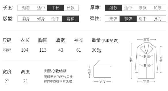 穿上这款风衣大小刚好、衣长到膝盖上面。