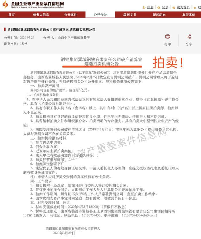 3月29日,据全国企业破产重整案件信息网公告,酒钢集团翼城钢铁有限责任公司(下称翼钢公司)将对破产财产进行处置,并拟遴选拍卖公司公开拍卖。公告显示,翼钢公司于2月25日被裁定破产,公司现有破产财产估计约8.3亿元。