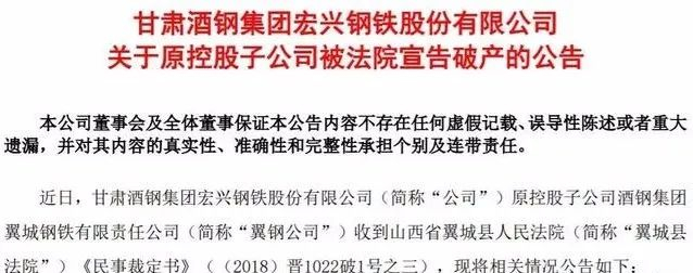 在此之前,2月28日,酒钢宏兴发布公告:翼城县法院于2020年2月25日裁定:宣告酒钢集团翼城钢铁有限责任公司破产,裁定自即日起生效!