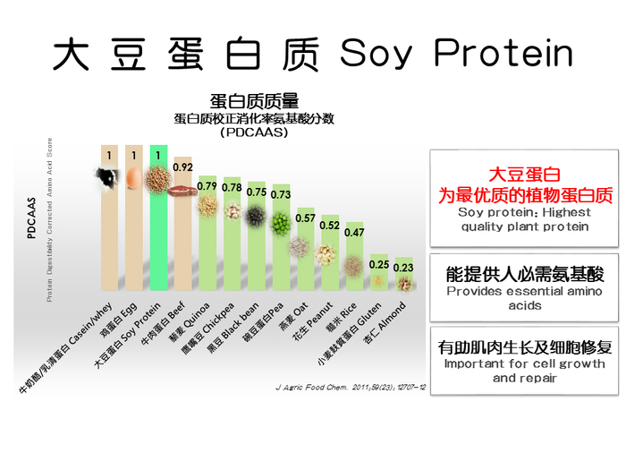 发表在《农业与食品化学杂志》的一篇研究结果显示,大豆蛋白是最优质的植物蛋白,可替代肉类、鸡蛋和奶制品中的蛋白质。