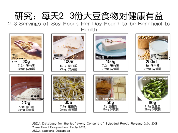 研究表明,每天2-3份的大豆食物,其提供的蛋白质和异黄酮对人体健康有益。