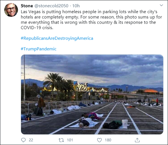 “内华达州是世界上最富有的国家的一个州,然而它只是在一个停车场上为无家可归者画出‘社交距离’的格子。”