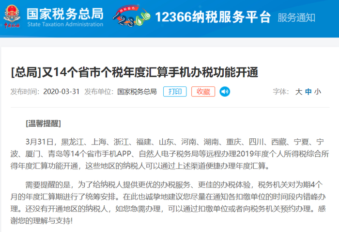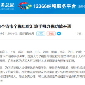3月31日,黑龙江、上海、浙江、福建、山东、河南、湖南、重庆、四川、西藏、宁夏、宁波、厦门、青岛等14地手机APP、自然人电子税务局等远程办理2019年度个人所得税综合所得年度汇算功能开通。
