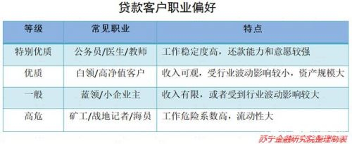 虽然在宣传材料里不会提及,职业确实是银行授信考虑的重要因素。下图展现了金融机构对于不同贷款客户的职业偏好: