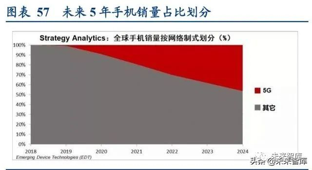 5G 时代来临,智能手机更新换代需求旺盛。根据 Strategy Analytics 的预测,5G 手机的销量到 2025 年接近手机总销 量的一半。伴随着手机的迭代,硬件性能必将不断提升,单部手机对电容器的需求也随之增加,例如快速充电功能 需要高质量的电容器技术,对电容器产品需求量大幅提高。以 iPhone 为例,一台 iPhone X 中 MLCC 用量达到 1100 颗,而在 iPhone 4S 中 MLCC 的单机用量仅为 496 颗。苹果公司计划于 2020 年推出 5G 版 iPhone,届时或将进一步 扩大对电容器的需求。