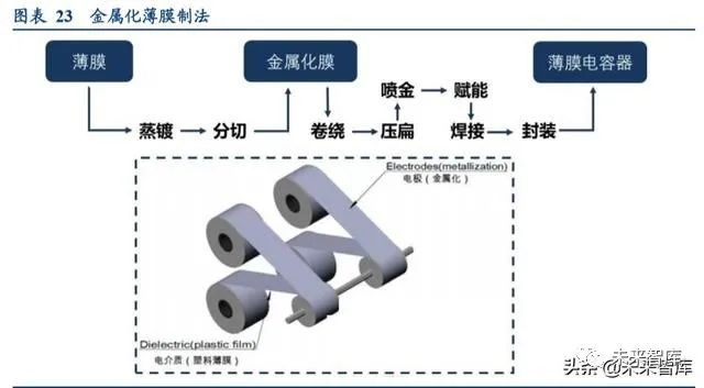 薄膜电容的主要原材料为塑料薄膜、塑料壳、喷金料等,其主要采用的“金属化薄膜制法”制作工艺是将薄膜进行 蒸镀、分切后制成金属氧化膜,然后在其上以真空蒸镀上一层很薄的金属作为电极,最后经过卷绕、压扁、喷金、 赋能、焊接、封装后制成薄膜电容器。这种制法可以省去电极箔的厚度,缩小电容器单位电容量的体积,所以薄膜 电容器较容易做成小型、大容量的电容器。