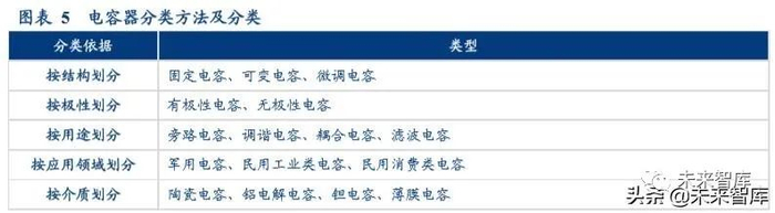 电容器分类方式有多种,生产厂商一般按照介质进行分类进行生产经营。电容器根据结构可以分为固定电容、可变 电容和微调电容;根据是否有极性可分为有极性电容和无极性电容;按照应用领域可以分为军用电容、民用工业类 电容和民用消费类电容;按用途可分为旁路电容、调谐电容、耦合电容和滤波电容;根据介质不同,电容器可分为 陶瓷电容、铝电解电容、钽电容和薄膜电容等四大类,电容器生产厂商一般按照介质材料分类进行生产经营。