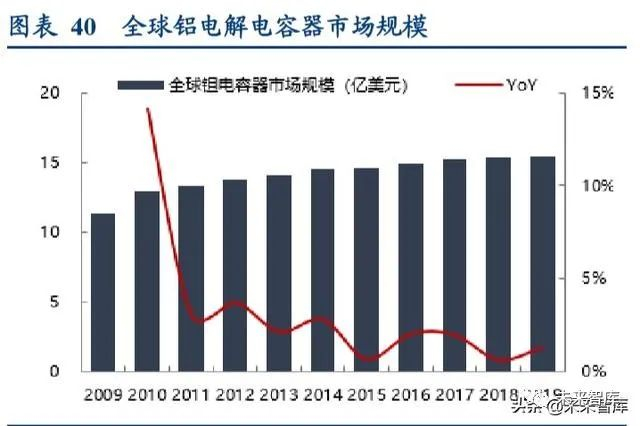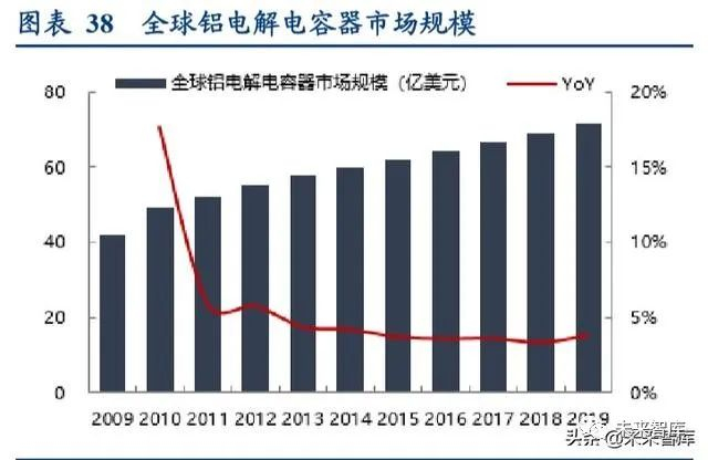铝电解电容方面,根据中国电子元器件行业协会的数据,全球铝电解电容市场整体规模近年来保持每年 4%左右的增 长,预计 2019 年达到 72 亿美元,约占整个电容器市场的 32%;中国铝电解电容器市场规模增速与全球市场持平, 预计 2019 年达到 341 亿人民币,占全球市场规模的 65%以上。