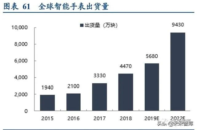 智能手表是目前可穿戴设备中集成度最高的产品,未来被消费者广泛接受后将有巨大市场空间。根据 Strategy Analytics 的数据,全球智能手表在 2019Q2 的出货量到 1200 万台,同比增长 44%,预计 2022 年将达到 9430 万块, 市场规模达到 275 亿元。和手机一样,智能手表在更新换代时也会大大增加电子元器件的用量。以 Apple Watch 为 例,第三代 Apple Watch 使用的 S3 芯片与上一代尺寸相同,但集成了蜂窝网络等更多元件;第五代 Apple Watch 在 第三代的基础上集成了电极式心率传感器、第二代光学心率传感器等,同时厚度降低了 6%。可以预见,更多小型化 的电容器产品将应用于智能手表中。
