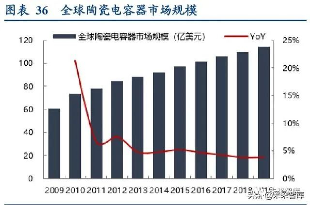 陶瓷电容市场份额占比不断增加,下游产品的小型化叠加 MLCC 技术进步使得 MLCC 对其它电容器有替代趋势。 全球陶瓷电容器市场规模占电容器总体市场规模的比重从 2009 年的 47%不断上升至 2019 年的 52%,市场规模达到 114 亿美元,而钽电容占比从 9%下滑至 7%,薄膜电容从 10%下滑至 8%。由于电容器下游的各类电子产品在一定程 度上均有小型化趋势(如消费电子智能化、轻薄化;军事装备轻型化、高性能化;汽车电子集成化等),需要越来 越多微型的电容器。而 MLCC 相较于薄膜电容器和铝电解电容器更易于小型化,且相比钽电容具有成本优势。同时 经过 MLCC 厂家多年的研发,出现了大量专为特定场景设计的 MLCC 产品,扩充了 MLCC 的应用场景。这些 MLCC 的电容量不断增加,工作温度范围进一步拓展(能在 150℃以上环境中稳定工作),且耐压性和频率特性得到升级。综合来看,在小型化与应用场景丰富化的大背景下,MLCC 有望占据更多市场份额。