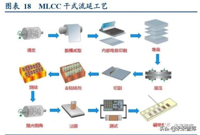 目前国内厂商普通采用干式流延工艺,其优点在于投资少、生产效率高,适合大批量生产,但产品在性能及质量上 存在缺陷,较难在高端市场推广应用。随着市场对产品的要求越来越高以及高端多层陶瓷电容器的需求不断增长, 湿式印刷工艺和瓷胶转移膜工艺因其制造工艺的先进性而备受关注,已逐步成为多层陶瓷电容器制造技术的发展趋 势。