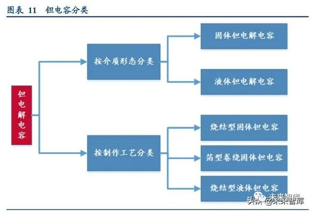 钽电容按照介质形态可以分为固体阴极钽电解电容和液体阴极钽电解电容,按照制作工艺可分为烧结型固体、 箔型卷绕固体和烧结型液体三种。固体钽电解电容是 1956 年由美国贝尔实验室首先研制成功的,其性能优异, 是电容器中体积小而又能达到较大电容量的产品。相比液体钽电容,固体钽电容不存在漏液问题,可有效避免 线路之间发生短路,大幅提高安全性,因而目前使用的钽电容几乎都是固体钽电容(烧结型固体钽电容占 95% 以上)。钽电容稳定性好、容量大,但由于造价昂贵,主要用于高端大容量场景。