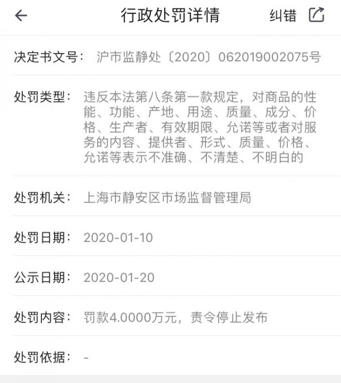 欧莱雅因虚假宣传遭到多次行政处罚,2020年1月该公司曾因对商品解释不明确被罚款4万元。